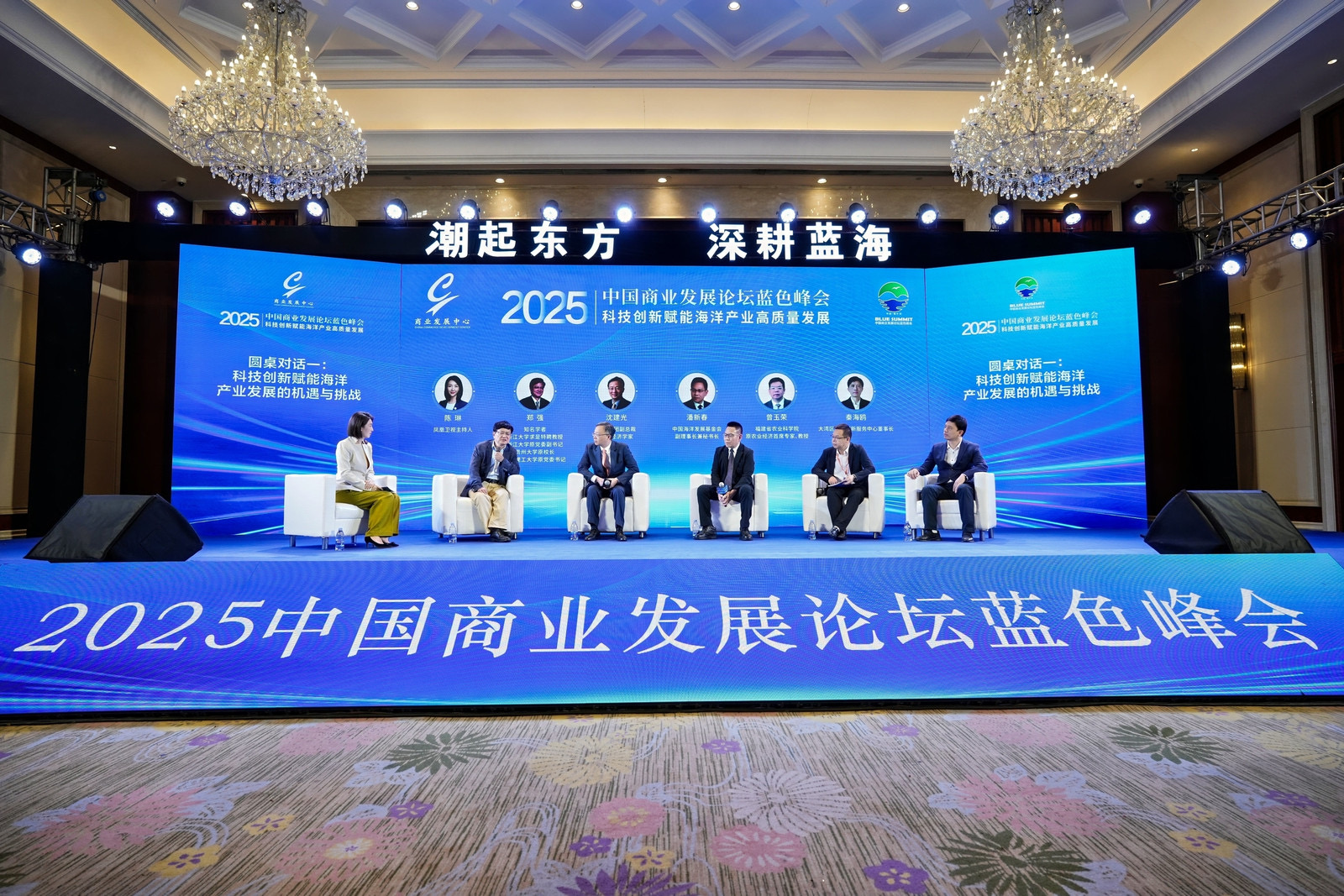 随后举行的首场圆桌对话以“科技创新赋能海洋产业发展的机遇与挑战”为主题。知名学者、浙江大学求是特聘教授郑强,京东集团副总裁、首席经济学家沈建光,中国海洋发展基金会副理事长兼秘书长潘新春,福建省农业科学院原农业经济首席专家曾玉荣,大湾区科技创新服务中心董事长秦海鸥共同参与讨论,从政策引领、人才培养、商业实践、产业升级等维度展开探讨,并借鉴了大湾区“四链融合”等前沿实践的系统性经验,共同为海洋产业的创新发展路径建言献策。凤凰卫视主持人陈琳主持了圆桌对话。